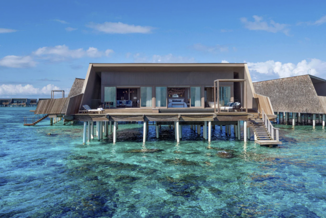 This resort is one of the Maldives’ most architecturally ambitious. Every structure takes inspiration from marine life and indigenous forms: water villas shaped like manta rays, the Whale Bar echoing the sweeping spine of a whale shark, the spa inspired by a Maldivian lobster shell. It is daring without being distracting — the architecture enhances rather than overwhelms the natural beauty.