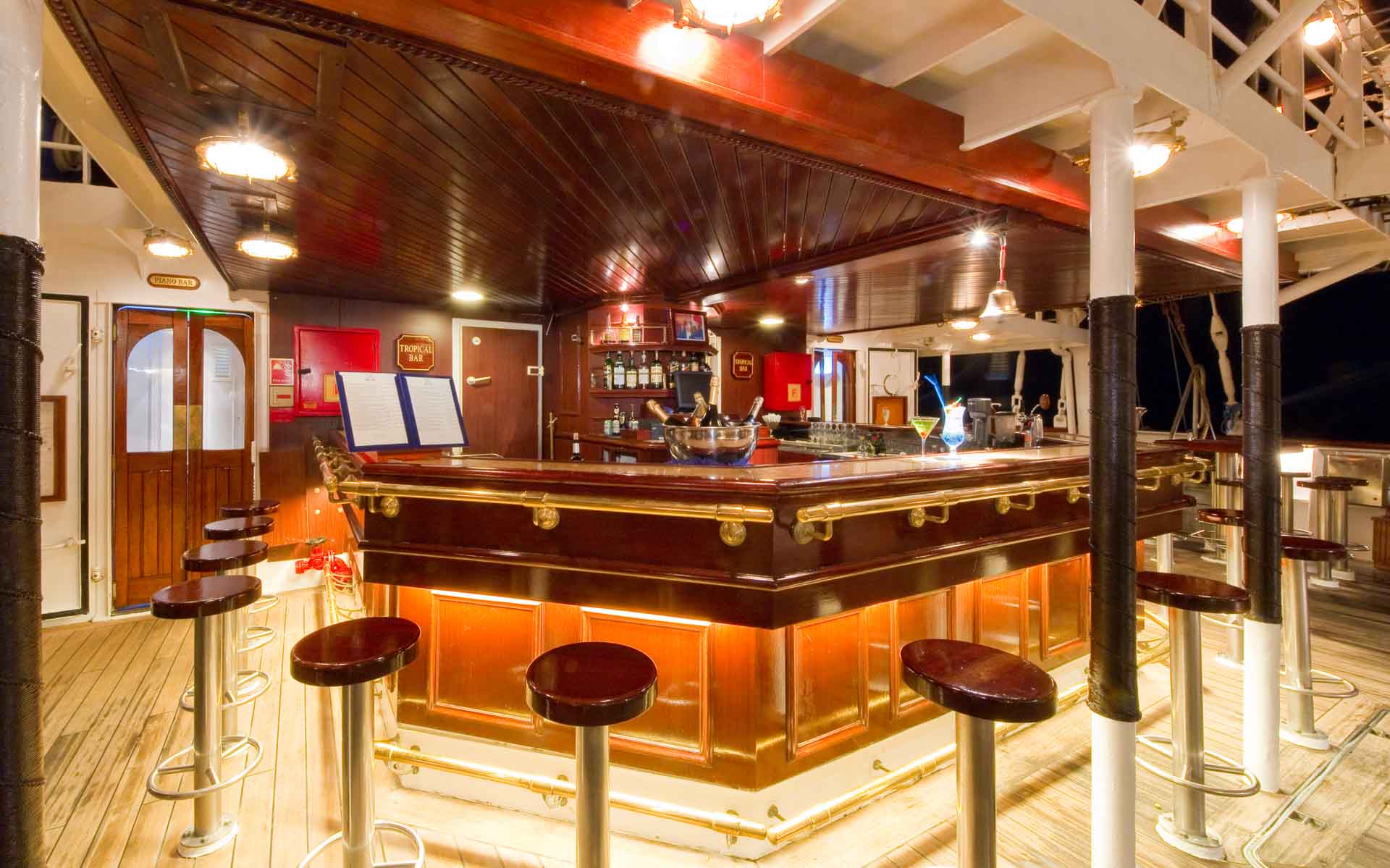 Each teatime, most guests head on deck to the indoor-outdoor Tropical Bar for cocktails and canapes and a range of tasty snacks, and to enjoy the musical entertainment and catch up on the day’s events. This bar is the place to head after dinner too, for more music, dancing and fun entertainment enjoyed by all.